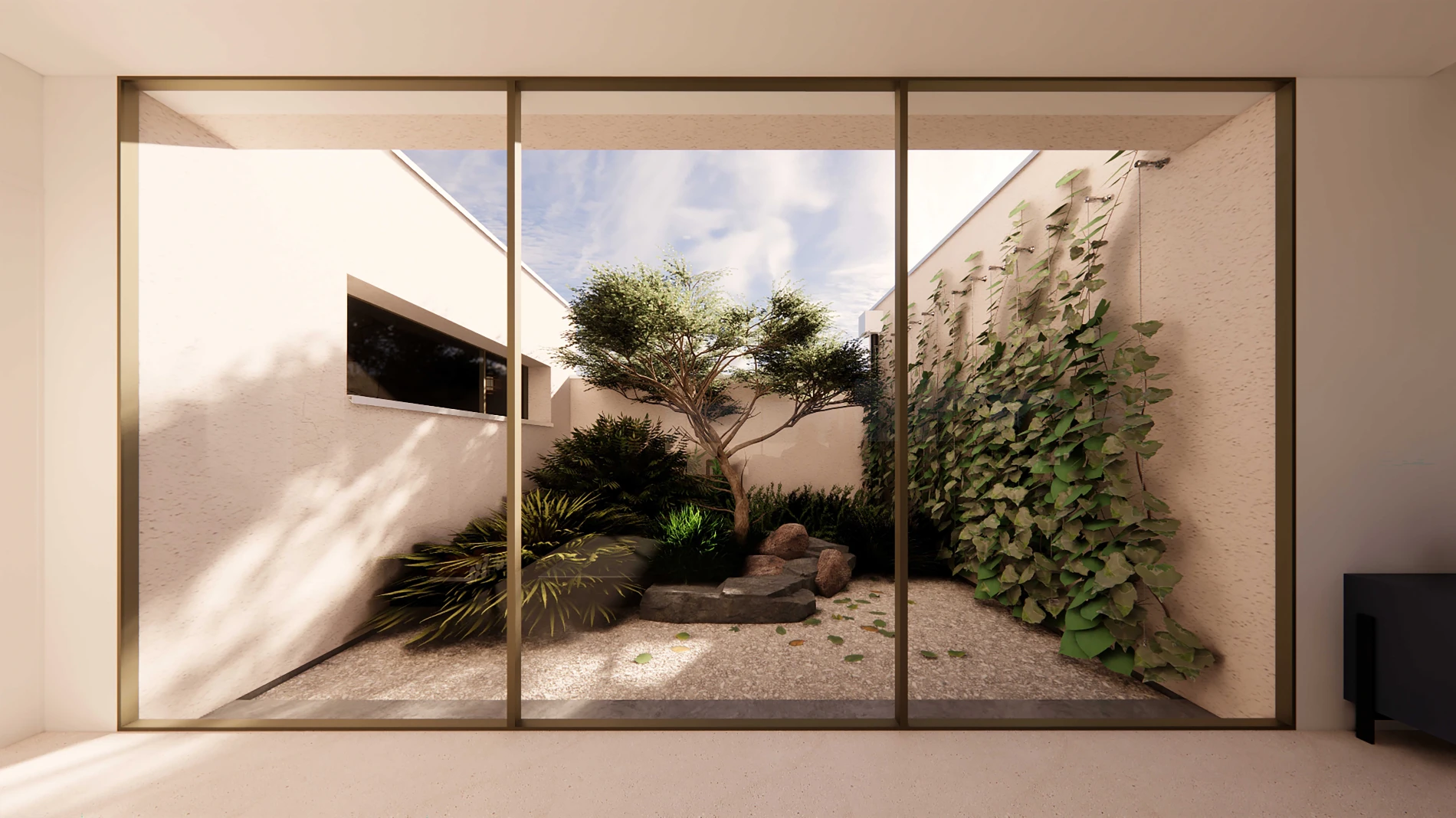 Ce projet prévoit la construction d'une villa aux lignes contemporaines sur la commune de Pessac, au sud de Bordeaux. L'implantation de la construction sur le terrain tient compte de sa petite superficie, de son orientation et des constructions voisines pour limiter les vis-à-vis. Cette villa s'adosse donc à la limite latérale nord-est pour profiter du jardin et de la piscine côté sud-ouest. L'entrée, positionnée dans la continuité du carport, en face du portail, est conçue comme un espace d'articulation. Elle débouche sur la pièce de vie au RDC tout en permettant l'accès à l'étage grâce à l'escalier aux marches suspendues. Bien qu'adossé à une limite latérale, le salon séjour reste un espace traversant grâce à la création d'un patio paysager. Celui-ci laisse entrer la lumière de l'est et facilite la ventilation naturelle de la pièce de vie. La cuisine, ouverte sur la pièce de vie mais légèrement en retrait profite d'un accès à la terrasse extérieure. La pièce de vie est très largement vitrée sur l'extérieur grâce aux généreuses menuiseries coulissantes minimalistes en aluminium et profite d'une orientation idéale sud-ouest. Le rez-de-chaussée accueille également une suite parentale ainsi qu'un salon marocain ouvert sur le patio. A l'étage, un dégagement distribue efficacement un bureau et trois chambres bénéficiant elles aussi d'un accès à une terrasse extérieure. A l'extérieur, le dessin des casquettes béton renforce l'esprit contemporain du projet et confère une identité singulière au projet. Les façades alternent un revêtement enduit et parement pierre pour faire écho aux teintes et matérialités locales. L'aménagement paysager alterne massifs végétalisés et pelouse engazonnée.