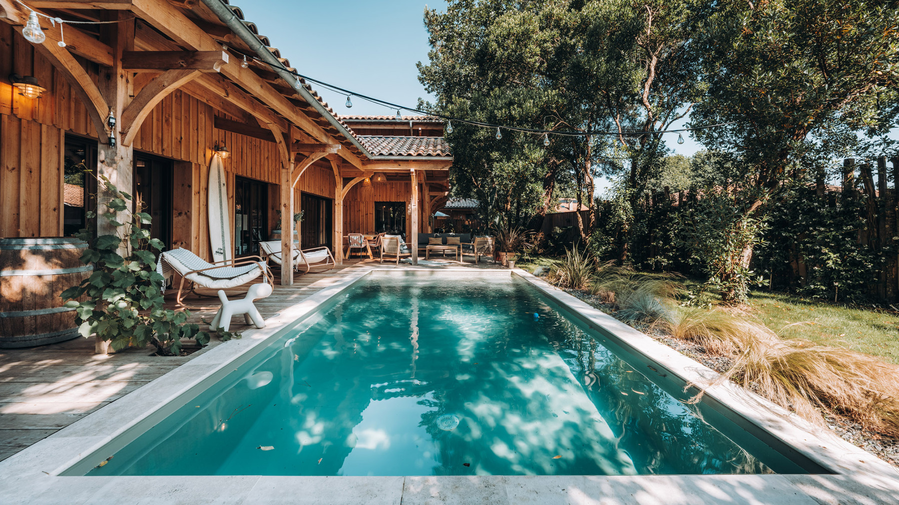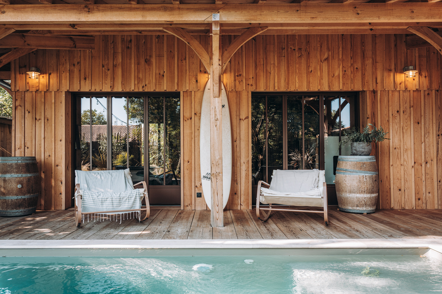 Le projet se situe sur un terrain situé à Cazaux au sud-ouest de Bordeaux. Au bout d’une impasse, cette maison de vacances s’installe au milieu d'une parcelle, à l’abri des regards. L’architecture s’inspire des constructions typiques du bassin. La maison est organisée toute en longueur pour s'adapter à la géométrie du terrain. Le rez de chaussée accueille une pièce de vie généreuse avec cuisine ouverte. Cet espace se caractérise par sa charpente bois traditionnelle apparente à l'intérieur. Dans la continuité, des chambres bénéficient également de beaux volumes et profitent et s'ouvrent sur une terrasse abritée à l’extérieur. L’étage accueille quant à lui une grande suite parentale et un bureau. On retrouve également une charpente traditionnelle apparente à ce niveau. Ces espaces profitent d'une vue remarquable sur la cime des arbres grâce à des ouvertures panoramiques en façade. A l’extérieur, les consoles bois, les pannes périphériques, les menuiseries bois et le bardage bois couvre-joints intègrent parfaitement le projet dans son environnement. Une piscine et un aménagement paysager soigné subliment le tout.