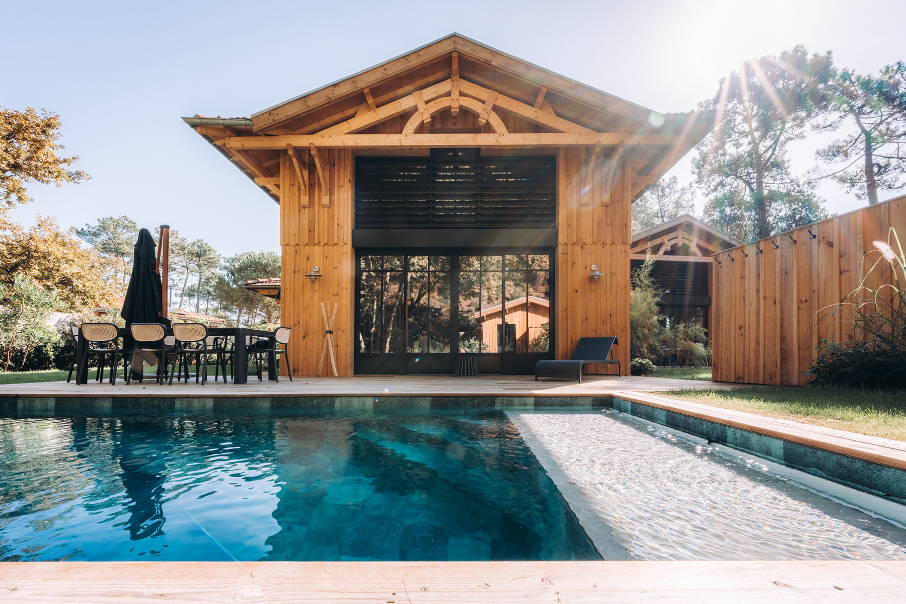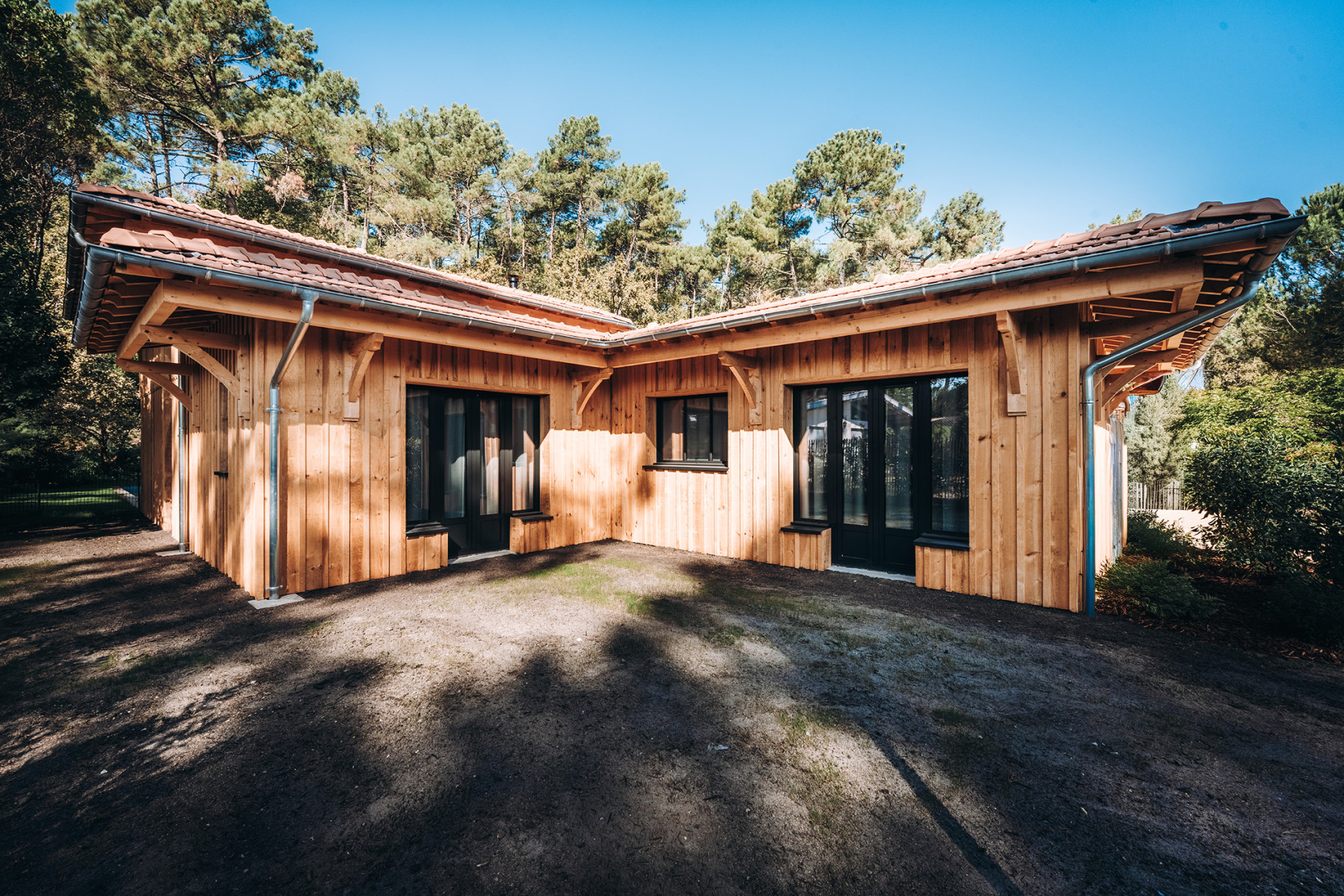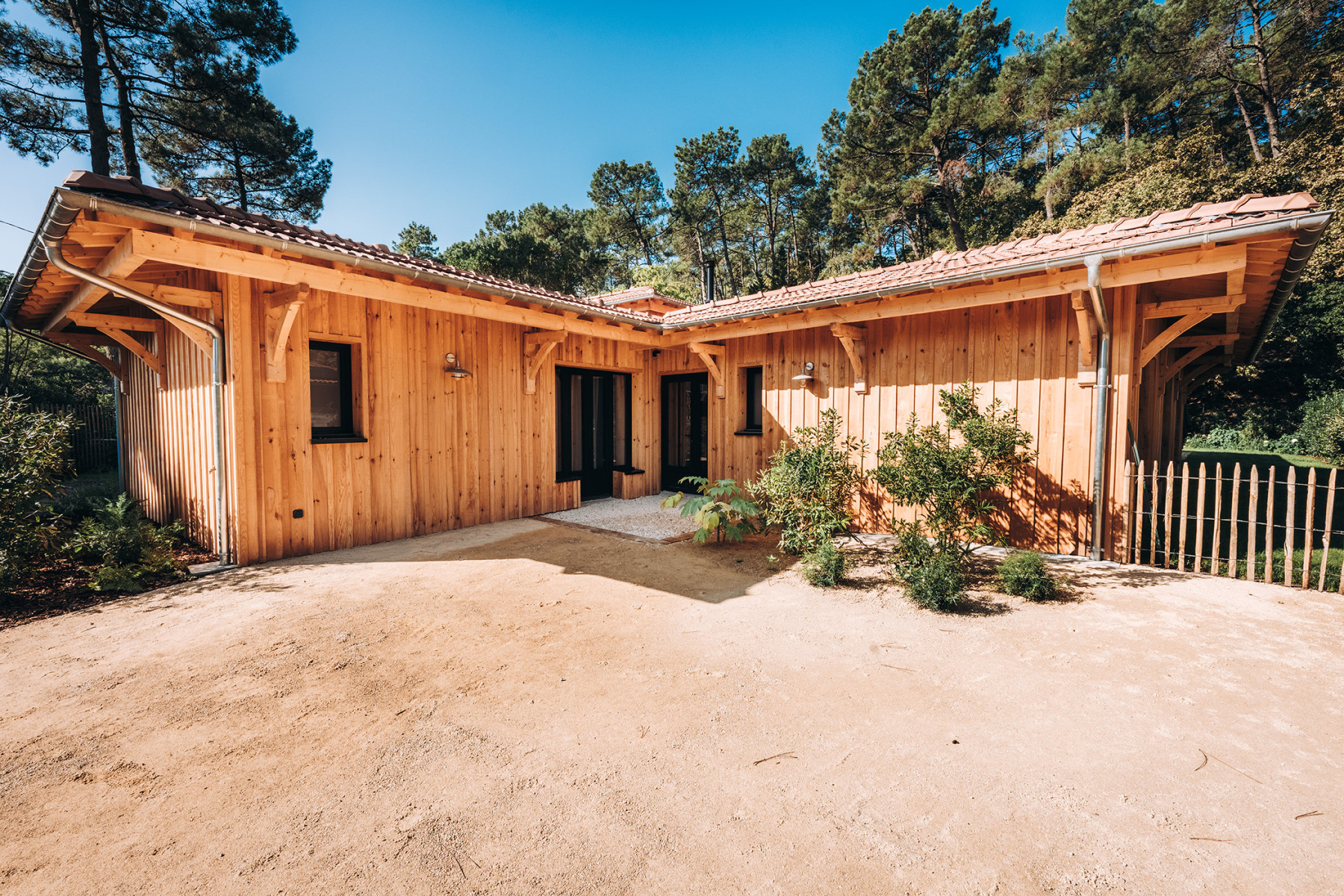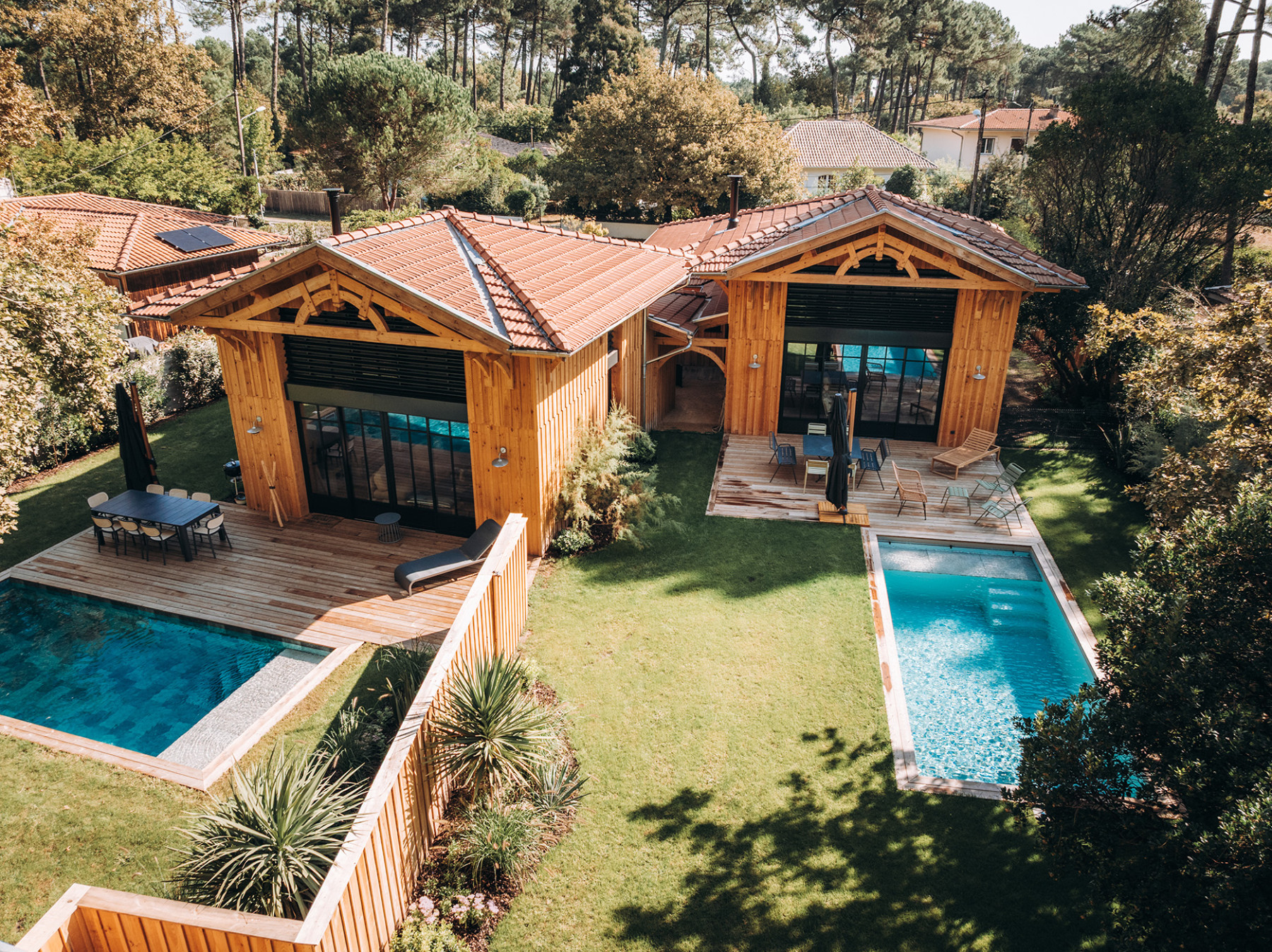 Le projet se situe sur un terrain à Lège Cap Ferret au sud ouest de Bordeaux. L'enjeu du projet consiste à implanter deux maisons de vacances sur une parcelle relativement étroite, en veillant à garantir pour chaque maison, une pièce de vie qui profite à la fois d'une orientation sud et d'une vue sur le massif forestier à l'ouest. L’architecture s’inspire des constructions typiques du bassin. L'implantation des deux maisons génère un patio central, véritable point d'articulation du projet. Les entrées des deux maisons se font naturellement depuis cet espace paysager. Ce patio offre un apport de lumière naturelle et une ventilation traversante efficace. Les pièces de vie sont généreusement vitrées pour profiter au maximum de l'ensoleillement et des vues sur les pins. Ces espaces se caractérisent par une grande hauteur sous plafond et une charpente bois traditionnelle apparente à l'intérieur. L'organisation intérieure se veut rationnelle, efficace pour optimiser la surface constructible disponible. A l'extérieur, les deux piscines et les terrasses installées entre les maisons et la forêt profitent d'un cadre privilégié à l'abri des regards.