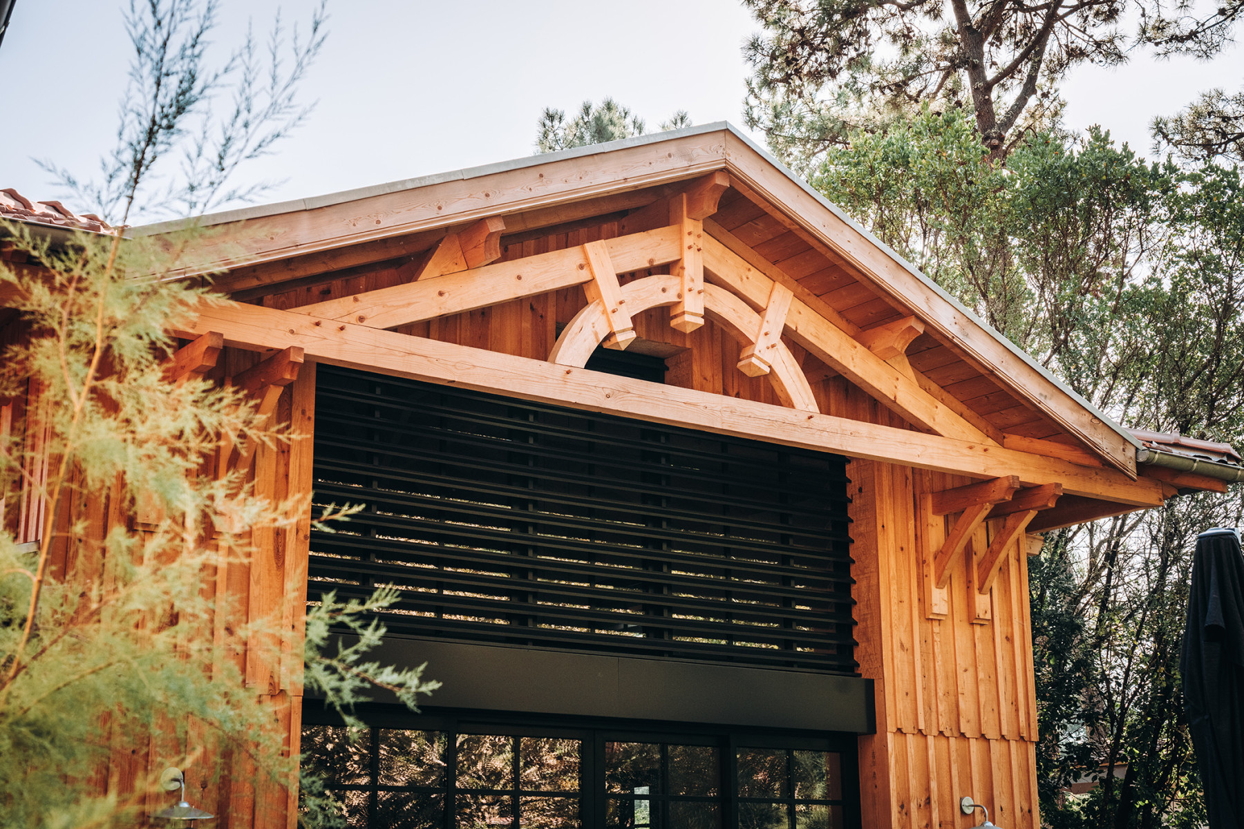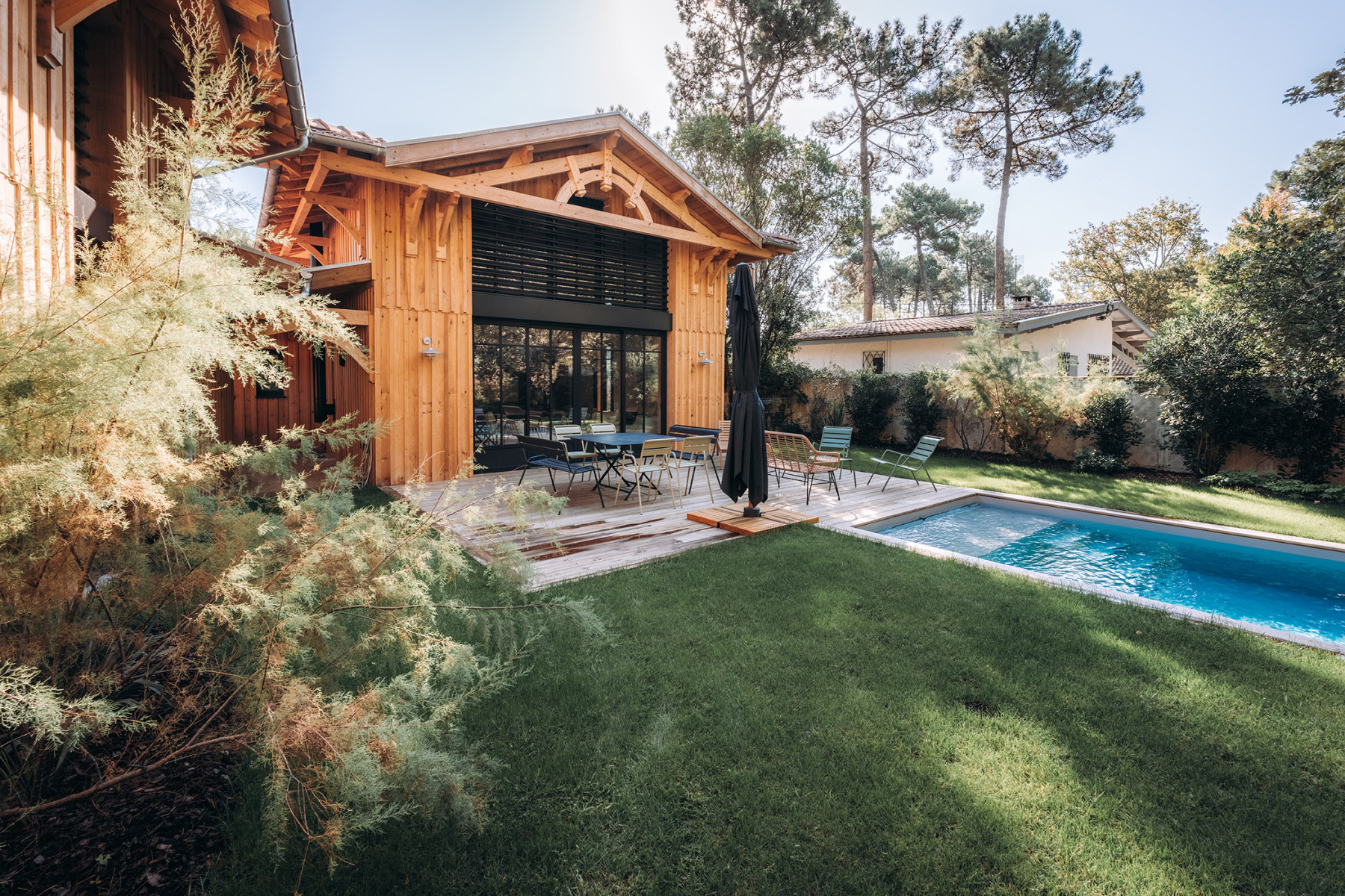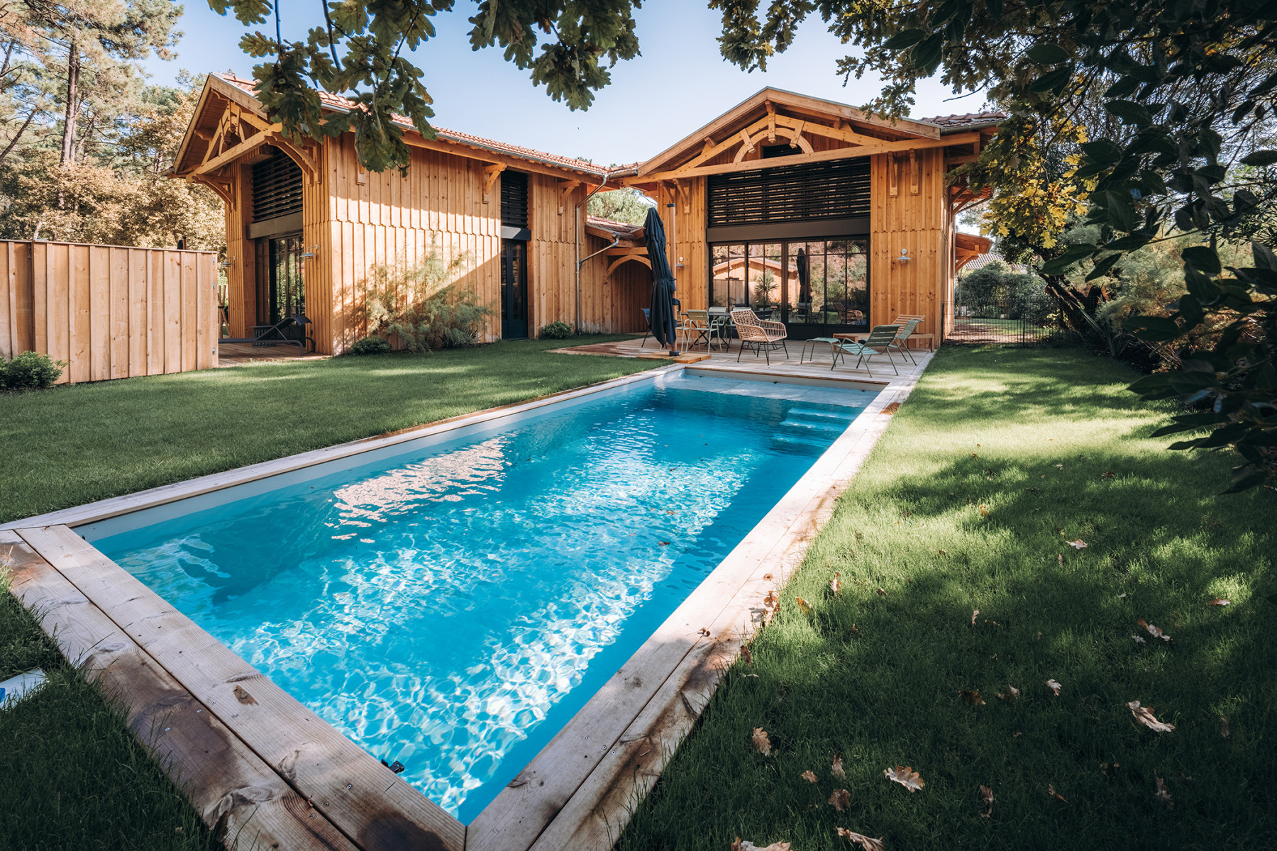 Le projet se situe sur un terrain à Lège Cap Ferret au sud ouest de Bordeaux. L'enjeu du projet consiste à implanter deux maisons de vacances sur une parcelle relativement étroite, en veillant à garantir pour chaque maison, une pièce de vie qui profite à la fois d'une orientation sud et d'une vue sur le massif forestier à l'ouest. L’architecture s’inspire des constructions typiques du bassin. L'implantation des deux maisons génère un patio central, véritable point d'articulation du projet. Les entrées des deux maisons se font naturellement depuis cet espace paysager. Ce patio offre un apport de lumière naturelle et une ventilation traversante efficace. Les pièces de vie sont généreusement vitrées pour profiter au maximum de l'ensoleillement et des vues sur les pins. Ces espaces se caractérisent par une grande hauteur sous plafond et une charpente bois traditionnelle apparente à l'intérieur. L'organisation intérieure se veut rationnelle, efficace pour optimiser la surface constructible disponible. A l'extérieur, les deux piscines et les terrasses installées entre les maisons et la forêt profitent d'un cadre privilégié à l'abri des regards.