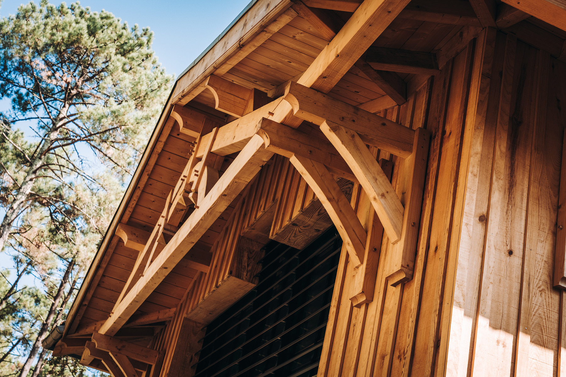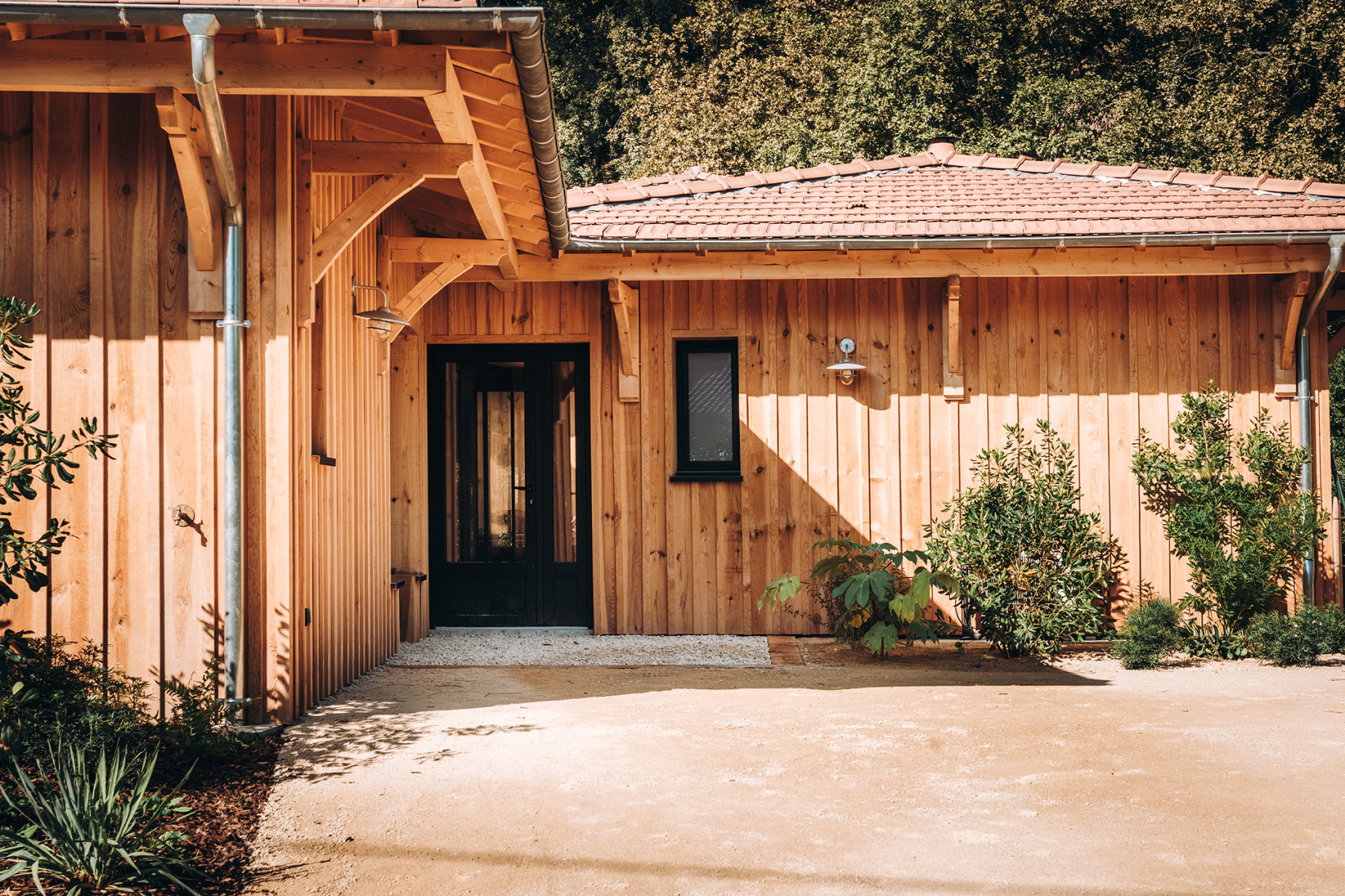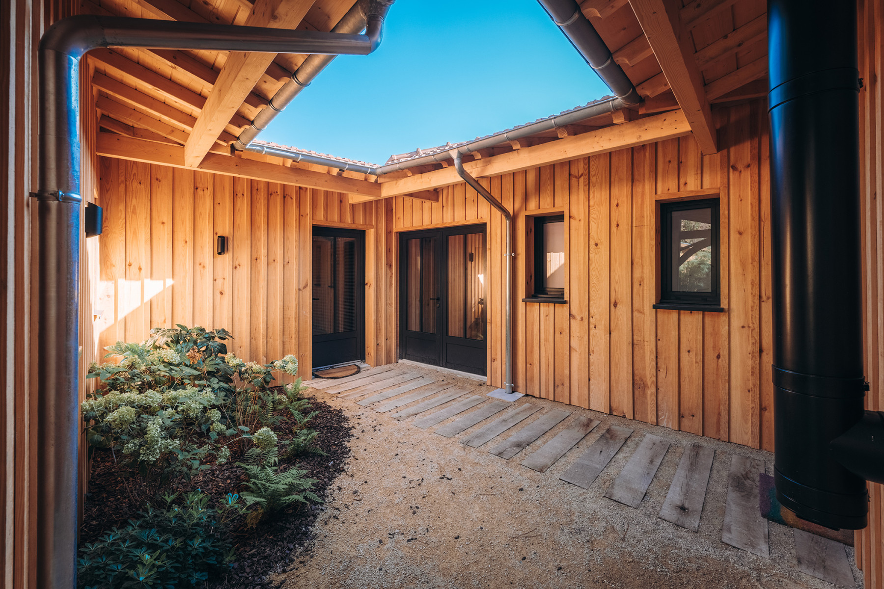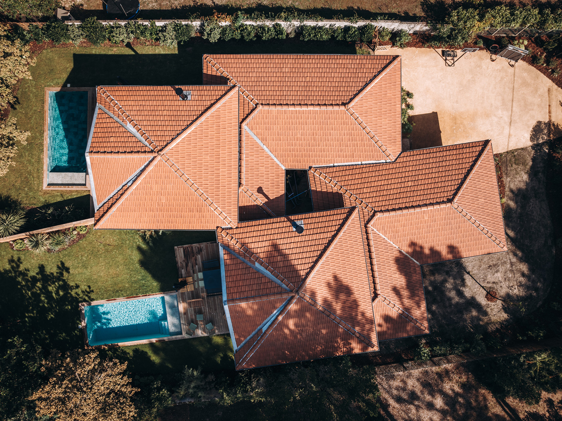 Le projet se situe sur un terrain à Lège Cap Ferret au sud ouest de Bordeaux. L'enjeu du projet consiste à implanter deux maisons de vacances sur une parcelle relativement étroite, en veillant à garantir pour chaque maison, une pièce de vie qui profite à la fois d'une orientation sud et d'une vue sur le massif forestier à l'ouest. L’architecture s’inspire des constructions typiques du bassin. L'implantation des deux maisons génère un patio central, véritable point d'articulation du projet. Les entrées des deux maisons se font naturellement depuis cet espace paysager. Ce patio offre un apport de lumière naturelle et une ventilation traversante efficace. Les pièces de vie sont généreusement vitrées pour profiter au maximum de l'ensoleillement et des vues sur les pins. Ces espaces se caractérisent par une grande hauteur sous plafond et une charpente bois traditionnelle apparente à l'intérieur. L'organisation intérieure se veut rationnelle, efficace pour optimiser la surface constructible disponible. A l'extérieur, les deux piscines et les terrasses installées entre les maisons et la forêt profitent d'un cadre privilégié à l'abri des regards.